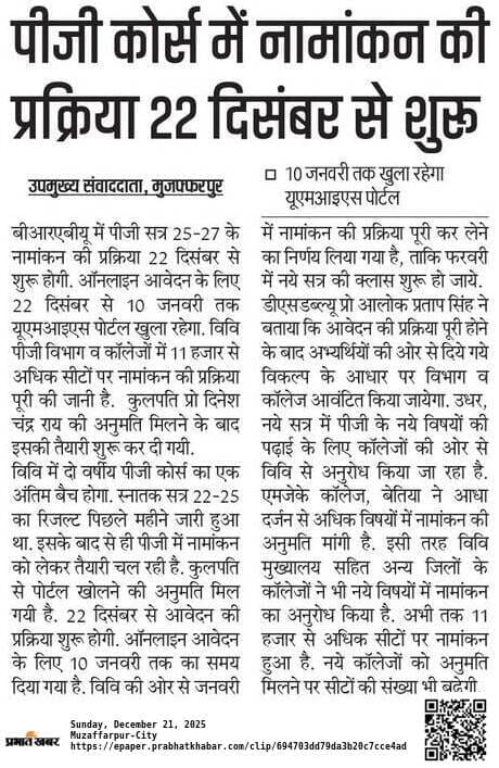 BRABU PG Admission 2025-27: बाबासाहेब भीमराव अंबेडकर बिहार यूनिवर्सिटी (BRABU), मुजफ्फरपुर ने शैक्षणिक सत्र 2025-27 के लिए स्नातकोत्तर (PG) पाठ्यक्रमों में नामांकन की घोषणा कर दी है। विश्वविद्यालय के आधिकारिक UMIS पोर्टल के माध्यम से ऑनलाइन आवेदन 22 दिसंबर 2025 से शुरू हो चुके हैं। यह उन हजारों छात्रों के लिए एक सुनहरा अवसर है जो मुजफ्फरपुर, वैशाली, सीतामढ़ी, चंपारण और शिवहर के विभिन्न पीजी विभागों और कॉलेजों में उच्च शिक्षा प्राप्त करना चाहते हैं।