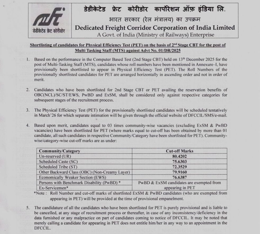 DFCCIL Stage-2 Result 2026: Dedicated Freight Corridor Corporation of India Limited (DFCCIL) has officially declared the Stage-II CBT results for the recruitment of Multi-Tasking Staff (MTS), Executive, and Junior Manager posts. Candidates who appeared for the second stage examination held in December 2025 can now access their results and scorecards. This recruitment drive is a major step in strengthening India’s rail infrastructure, and thousands of aspirants are competing for these prestigious positions. The DFCCIL Stage-2 Result 2026 marks the penultimate step before Document Verification and Medical Examination. Candidates are encouraged to check the category-wise cut-off marks and verify their roll numbers in the provided merit list PDF.