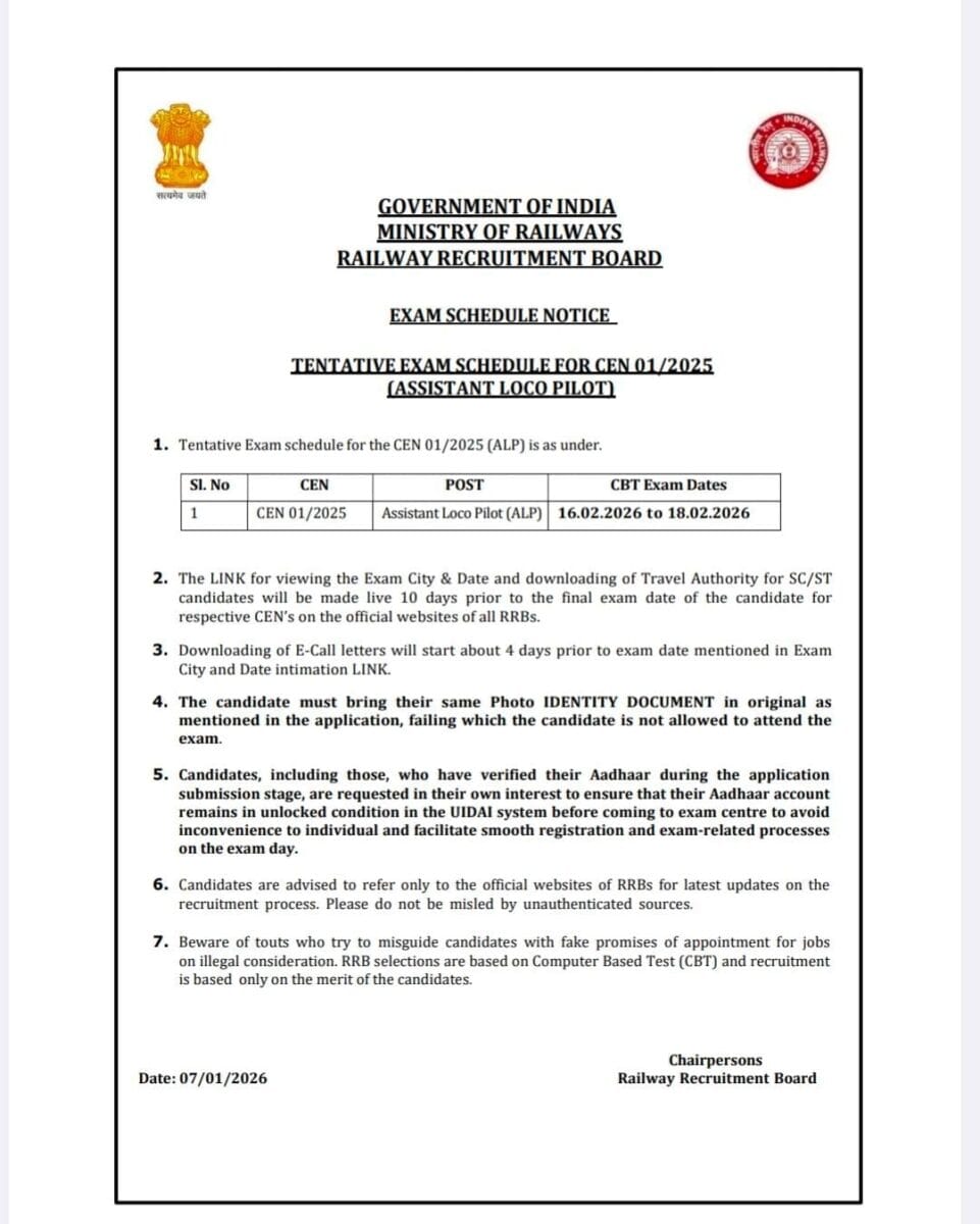 Note: Information is based on RRB Notice dated 07/01/2026. Keep visiting official portals for latest RRB ALP Exam Date 2025 updates.
